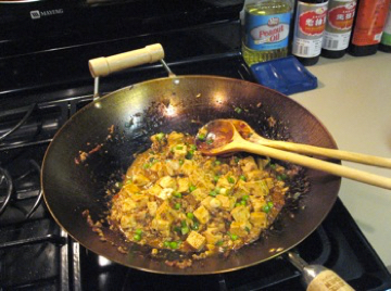 2. Heat wok over high heat. Swirl in oil. When oil is hot, slightly brown ginger. Add pork and stir-fry until it is no longer red. Stir in sauce mixture. Cook and stir constantly for 10 seconds. Add tofu. Mix well. Turn heat to low. Pour in broth, cover, and cook over low heat for 3 to 4 minutes. Stir in cornstarch water. Cook and stir constantly until sauce is thickened. |